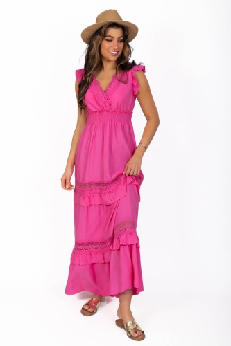 Długa sukienka boho z gipiurą na szerokie ramiączka Różowa - W241288